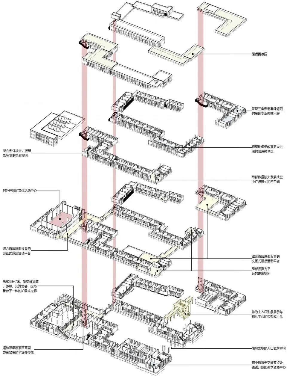 新教學樓在進行空間布局時,參考了中國傳統書院的形制,采用了院落式布局的思路。設計將整個校園的庭院分為四個體系,分別為濕地花園、生物園地、童心樂園及屋頂種植園,并相應地進行了景觀設計和內涵填充,以達到輔助教學與擴展教育場所的目的。