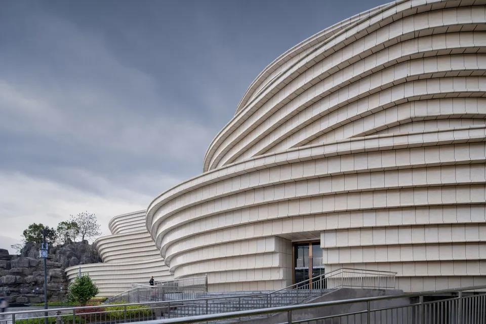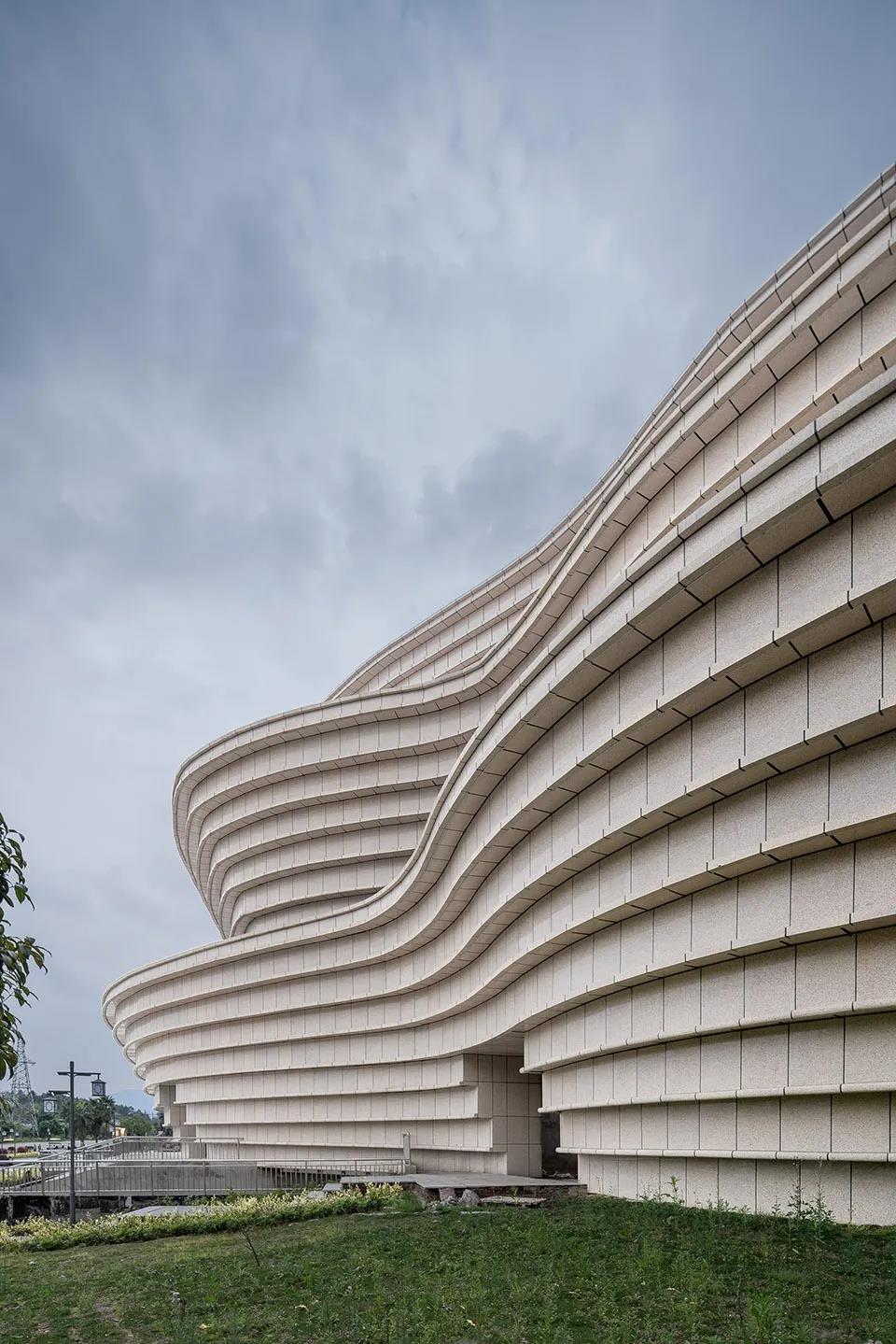 ▼展示中心外觀,采用層層疊疊相互穿插的“魚鱗壩”式設計