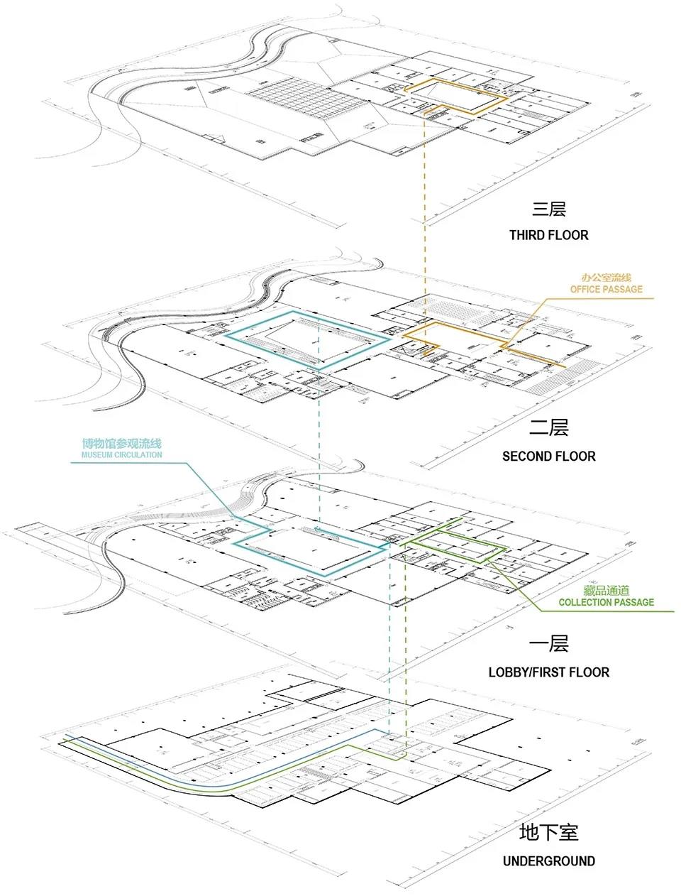 游客進入建筑內部最先到達的空間是展覽中心的大廳,兩層通高12米中軸對稱的中庭設計為整個建筑的空間核心。首層兩個常設展廳和一個臨時展廳圍繞中庭廳布置,通過直通二層的樓梯連接布局相同的二層展廳。為考慮觀眾參觀路線的便捷性和流暢性,避免參觀路線的的折返和重復,各個展廳出入口獨立設置并與其他功能區有效銜接。展廳東南部分為藏品區,設置有石器、瓷器、陶器、金屬類、瑪瑙、錢幣、書畫、革命文物等八大類藏品庫房,保持恒濕以利于藏品的長久安全的存放。藏品流線完全獨立,所以如有新藏品入館會在地下的卸貨平臺完成裝卸并通過專用通道及貨梯進入展館以確保藏品的安全。辦公區垂直藏品區設立,在建筑南側消防環道有獨立的出入口,有效利用了南側順應山勢的消防道路。