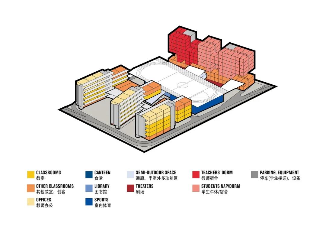建筑師們面臨的,首先是功能多的巨大挑戰,在實際場地面積僅約1.6萬平方米的場地內,容積率接近于2.5 (一般學校建筑容積率為1左右)。校園設計必須滿足教學、宿舍、活動等各種功能;同時,又有著緊迫的時間壓力,從立項到交付學校,設計、建造周期僅僅13個月。要知道,就一般教育類建筑而言,一所高品質學校從設計到竣工,通常需要2-3年時間完成。