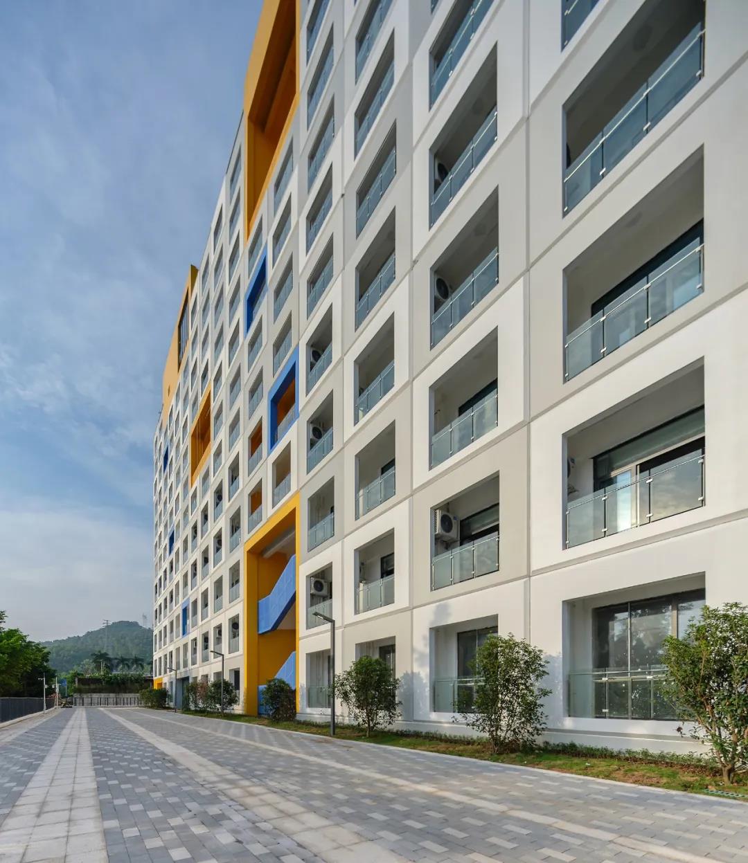 宿舍樓——面朝錦龍大道。錦龍大道是通往學校的主要街道之一,從遠處可以清晰地看到宿舍樓標志性的立面,建筑師采用了三種不同厚度和色調的預制面板組成了立面,最厚的面板為淺灰,中厚度的面板為中灰,最薄的面板為深灰。