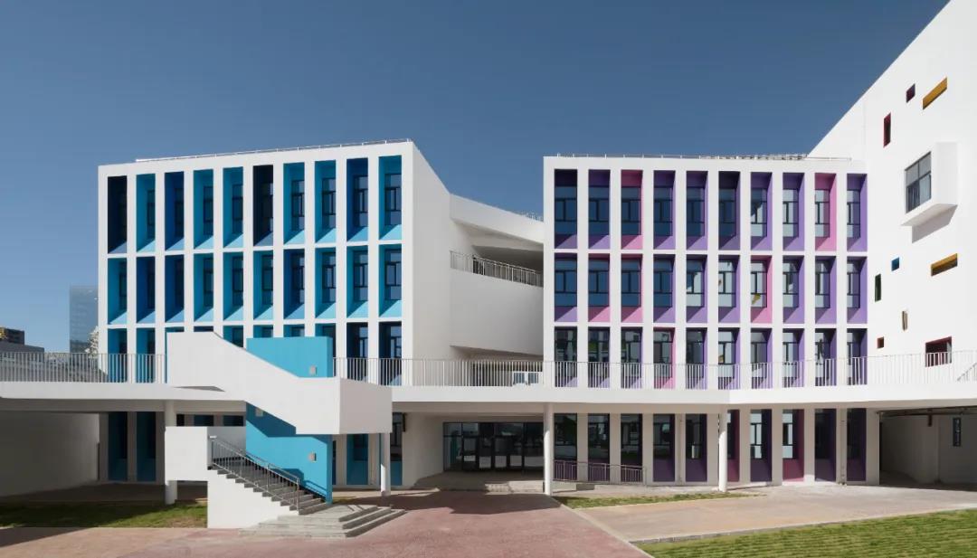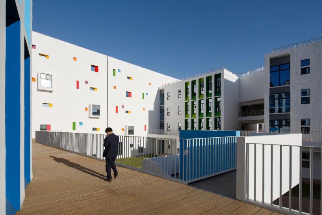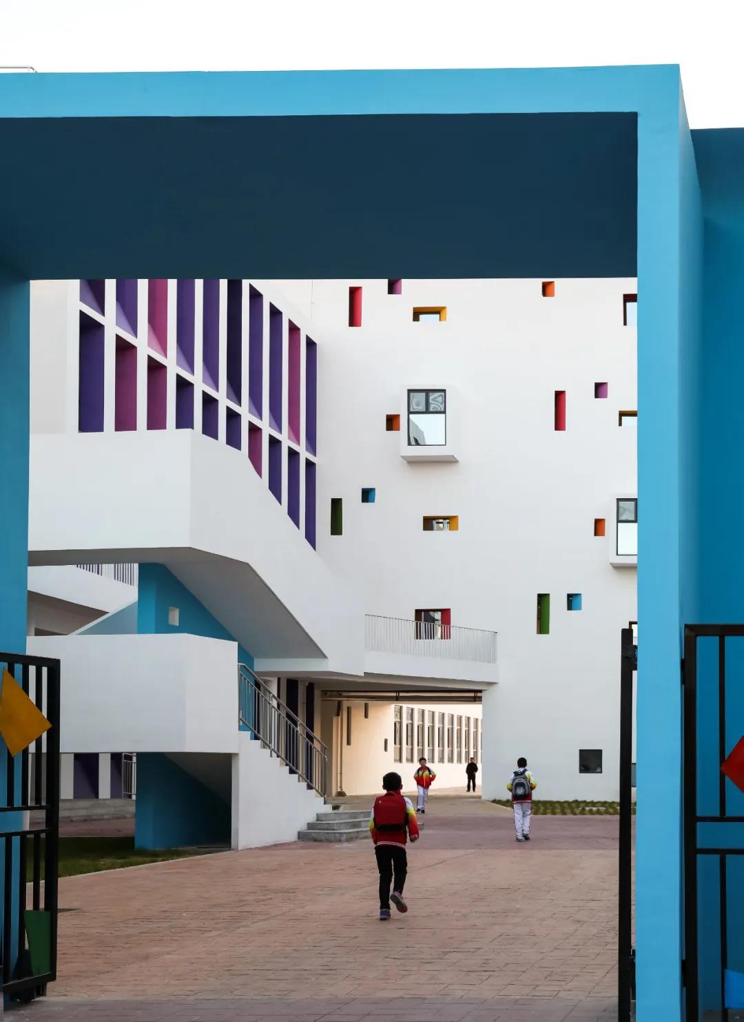 設(shè)計(jì)的主要理念是:將校園建筑空間塑造成為一個(gè)具有儀式感的場(chǎng)所。按年級(jí)分為6棟立方體教學(xué)單元,小學(xué)生和教師活動(dòng)在自己的的空間中,滿足一個(gè)小群體的歸屬感。同時(shí)用不同顏色表達(dá)不同的年級(jí)的教學(xué)樓的差異性,以低成本解決了不同年級(jí)教學(xué)樓的識(shí)別問題和工程建造的問題。