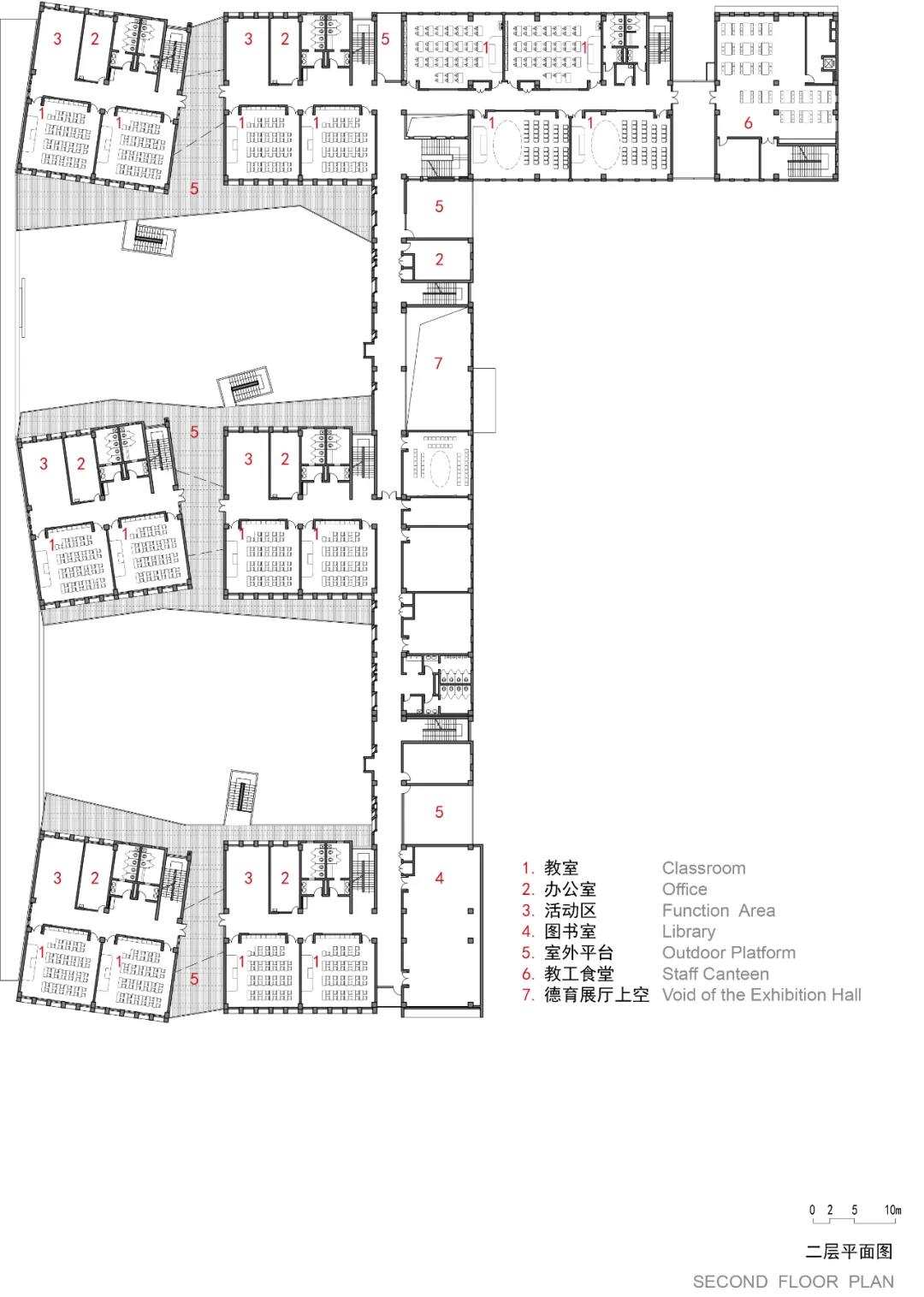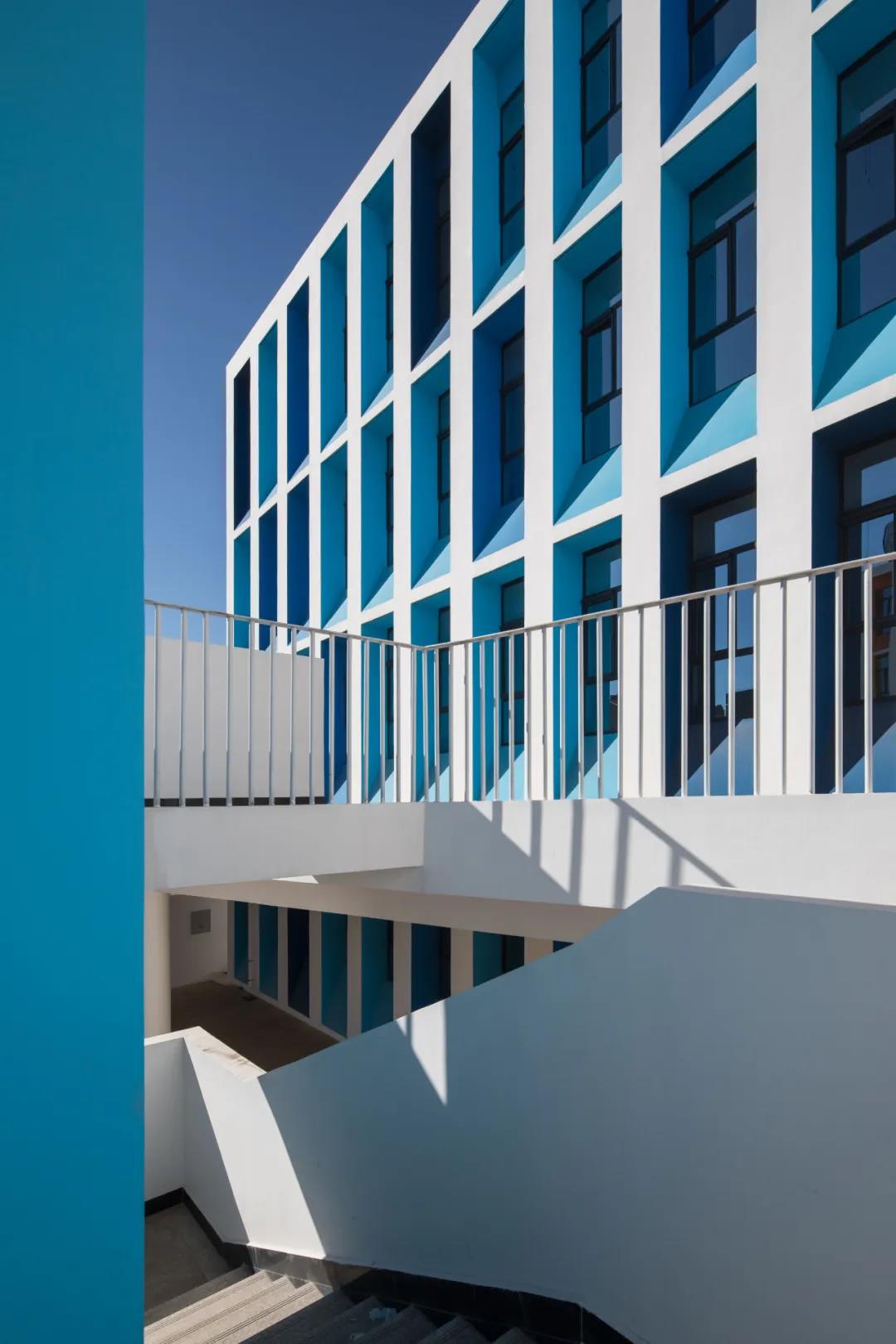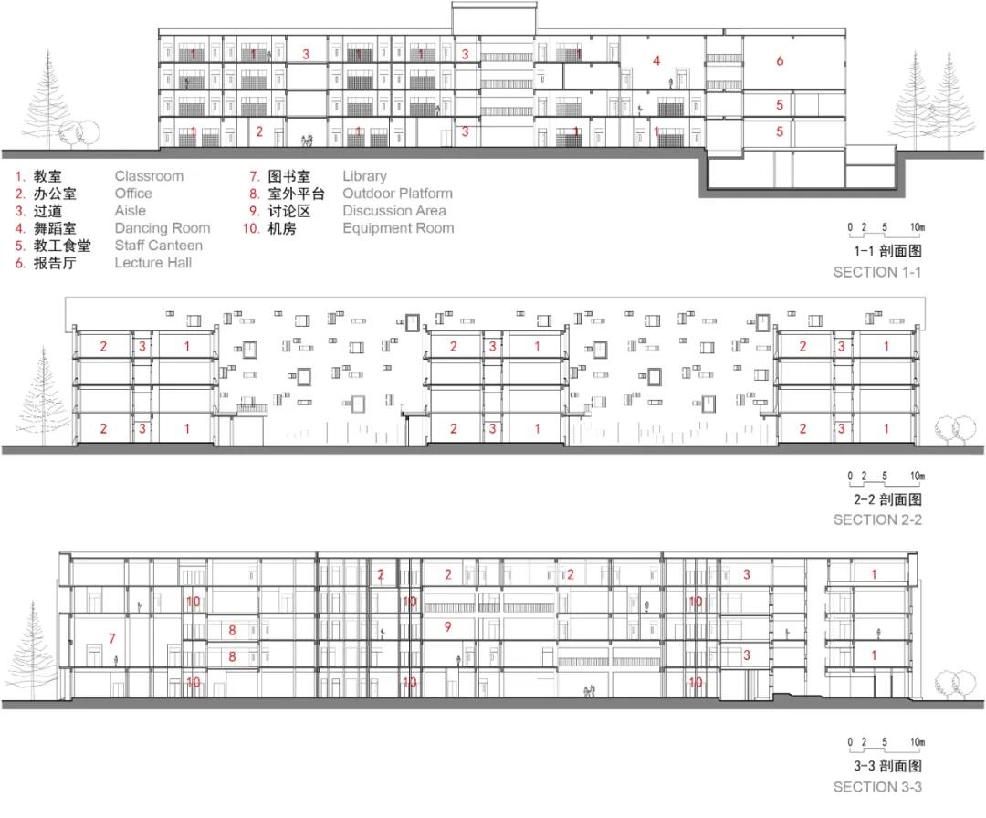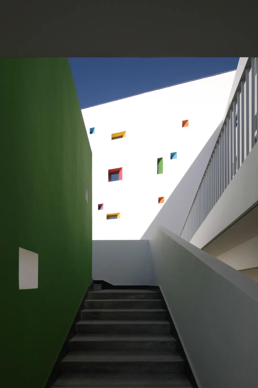 此外,設(shè)計(jì)也提供給校園多樣化的室外交流空間,包括:立方體周圍的院落、連廊、平臺(tái)。這些室外空間在有限的場(chǎng)地內(nèi),為鼓勵(lì)不同年級(jí)的學(xué)生、教師互相交流創(chuàng)造了條件,讓校園散發(fā)更多的活力。