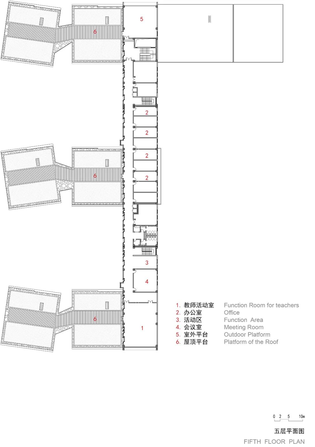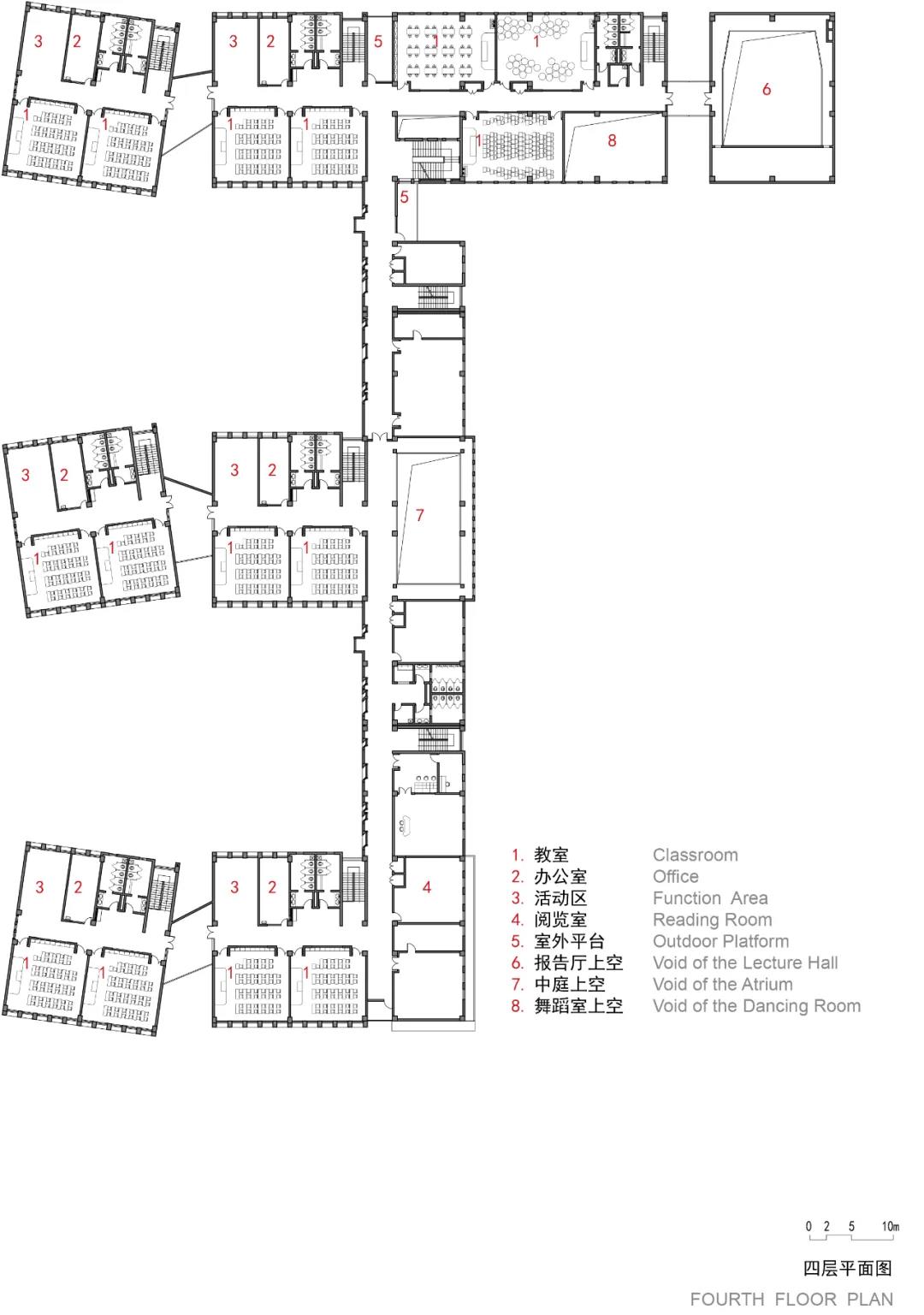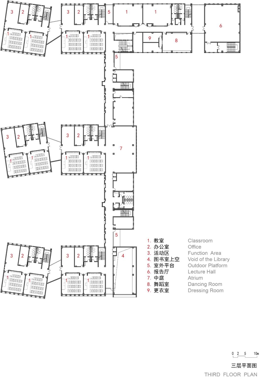此外,設(shè)計(jì)也提供給校園多樣化的室外交流空間,包括:立方體周圍的院落、連廊、平臺(tái)。這些室外空間在有限的場(chǎng)地內(nèi),為鼓勵(lì)不同年級(jí)的學(xué)生、教師互相交流創(chuàng)造了條件,讓校園散發(fā)更多的活力。