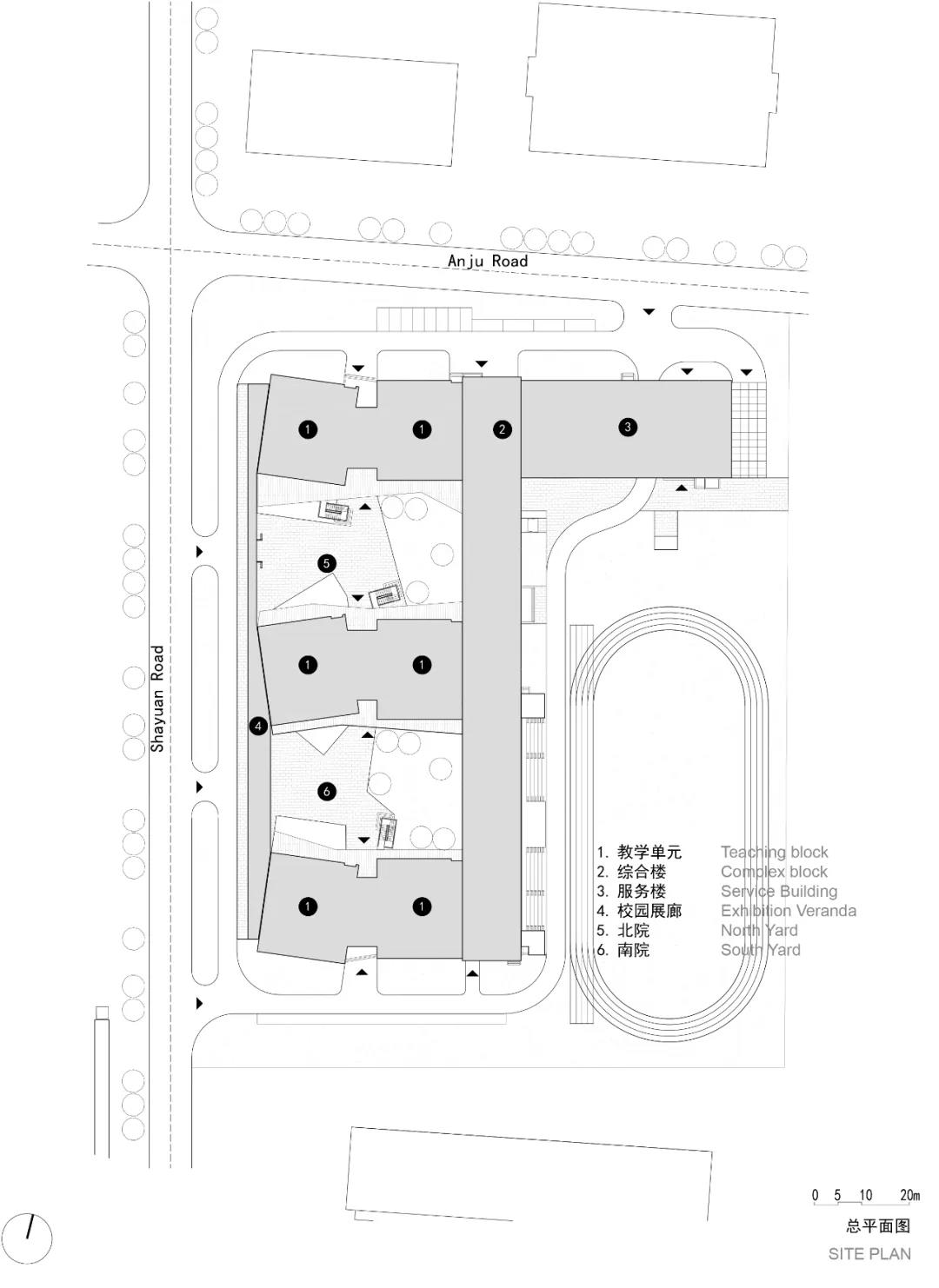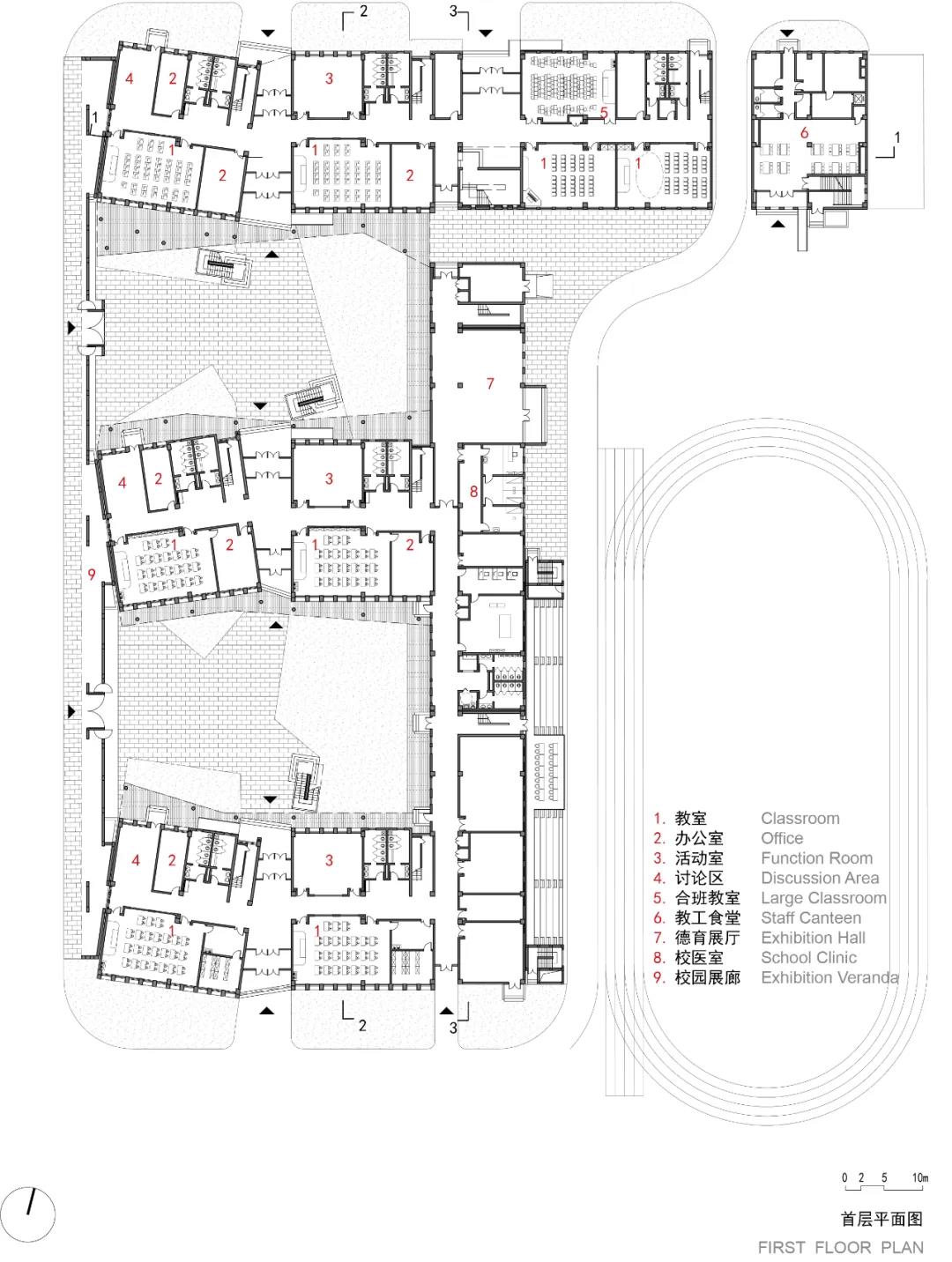 采用集約的設(shè)計(jì)布局模式,場(chǎng)地西側(cè)布置教學(xué)空間和校園展廊,東側(cè)為教工食堂、報(bào)告廳和體育運(yùn)動(dòng)場(chǎng)地,中部的綜合教學(xué)樓包含了圖書室、閱覽室、展廳等輔助的功能設(shè)施,同時(shí)一定程度隔離了操場(chǎng)噪音對(duì)主要立方體教學(xué)單元的影響。