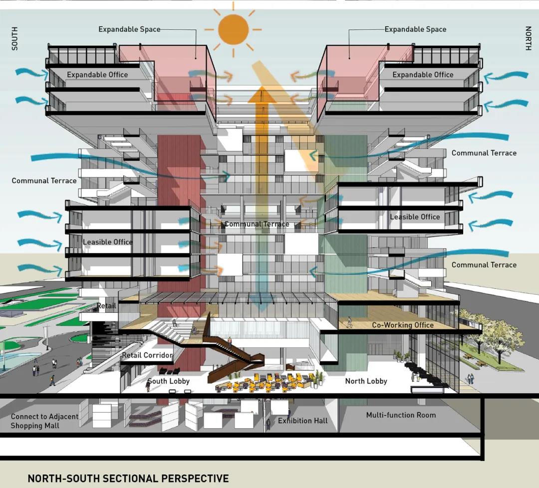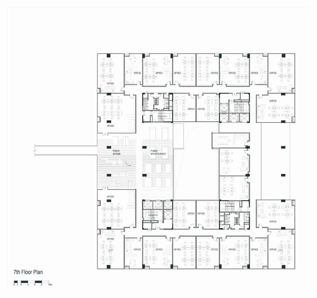 原本單調(diào)孤立的樓板產(chǎn)生了空間關(guān)系,低層建筑的街道公共空間出現(xiàn)在高層的結(jié)構(gòu)中,同時(shí),內(nèi)側(cè)的辦公空間也有自然采光和通風(fēng),各層大平層均可雙側(cè)采光,這里辦公的人,也有機(jī)會(huì)看到彼此,提升了場(chǎng)所認(rèn)同感。