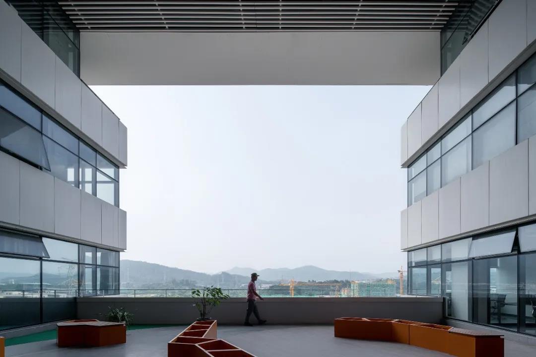 為了在高層建筑中實(shí)現(xiàn)類似低層廠房建筑的街道公共空間,我們打開建筑的“核心”,把一個(gè)“大核”拆解成幾個(gè)“小核”,讓建筑原本的“實(shí)心”變成“空心”,有更大的空間撐滿可建設(shè)用地,樓板圍繞四個(gè)核心筒像搭積木一樣展開,并在頂層預(yù)留了未來企業(yè)擴(kuò)展的空間(后續(xù)也確實(shí)被入駐企業(yè)改造擴(kuò)建了)。