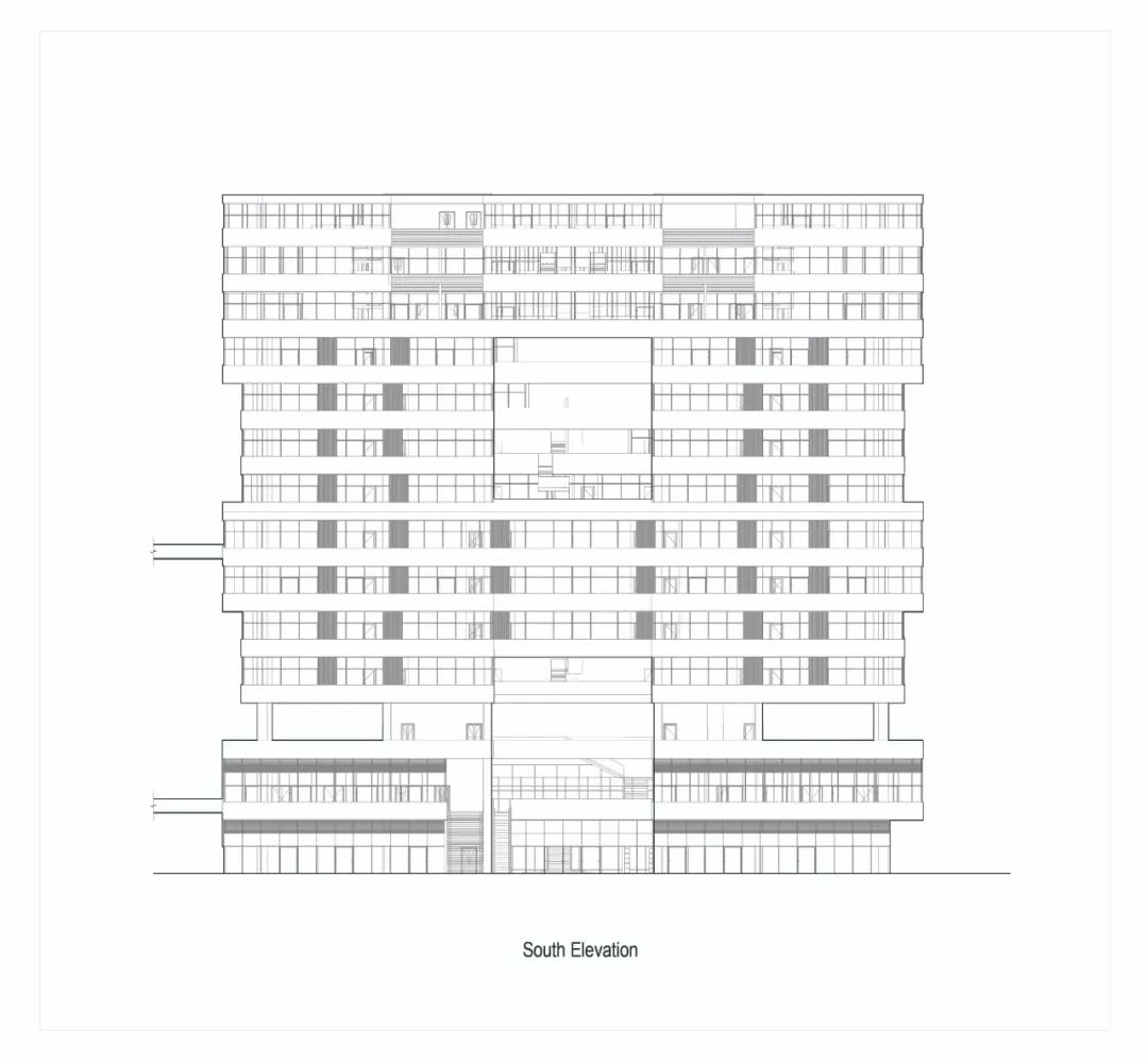 設(shè)計(jì)按照每三層共享一個(gè)大平臺(tái)的空間邏輯,隨著樓層的變化,依次在四個(gè)面的不通高度位置出現(xiàn)。我們?cè)诜桨笖U(kuò)初階段采用ArchiCAD的BIM建模型方式,全部外墻圖紙由三維模型直接導(dǎo)出成圖,所有空調(diào)室外機(jī)以及頂板等二次結(jié)構(gòu)一體澆筑成形。