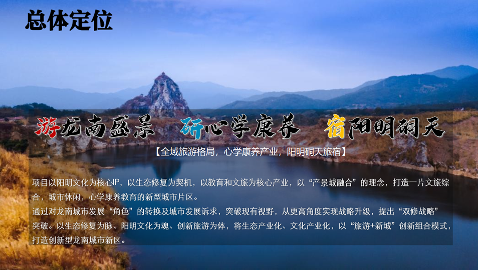 整體目標:以陽明文化為核心脈絡和IP,以玉石仙巖為核心節點并進行延伸,以礦山修復為契機,以城市發展為配套基礎;在全國陽明文化版圖里,另辟蹊徑,結合礦山和洞天的資源,打造地域唯一性和項目獨特性,將陽明文化結合市場發展需求和國際學術交流,從中國心學延伸到心學的國際發展和交流,讓文化更具市場粘合度,拓展文化變產業的廣度和深度。