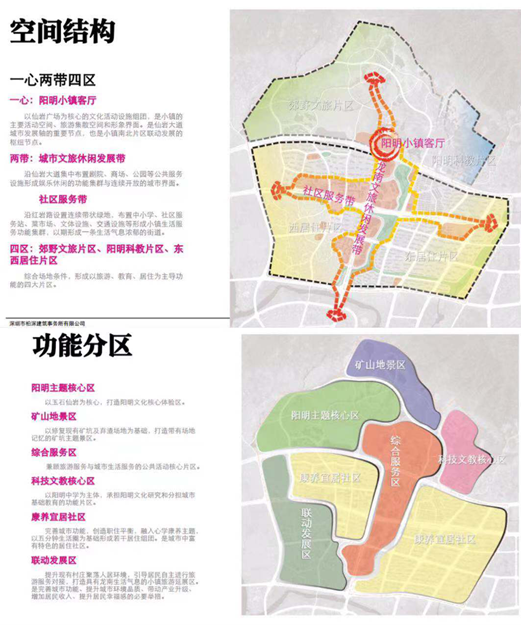 規劃結構:以一心(陽明小鎮客廳)兩帶(城市文旅休閑發展帶、社區服務帶)四區(郊野文旅片區、陽明科教片區、東、西居住地區)。